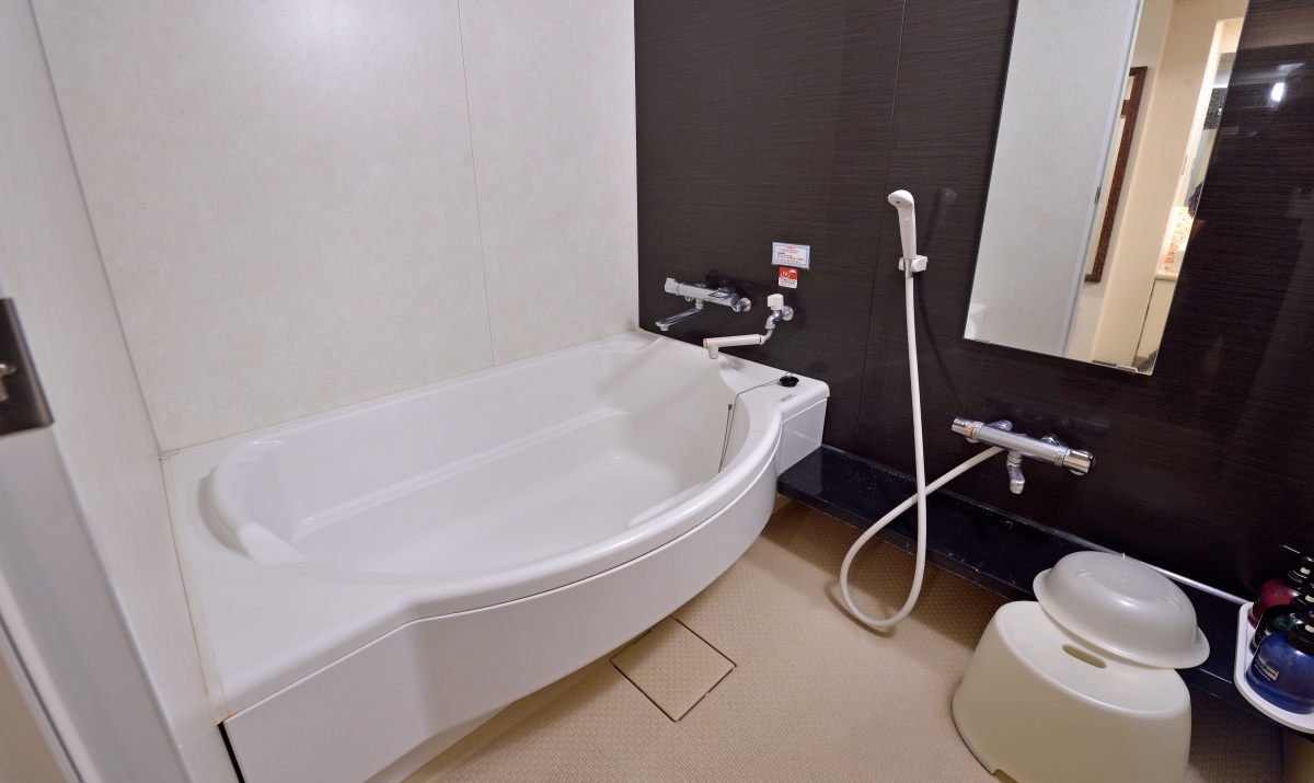 ひとまわり大きいバスルームにはTVも設置。肩まで浸かれるバスタブで温泉を楽しみながらリラックスタイムをお過ごしください。