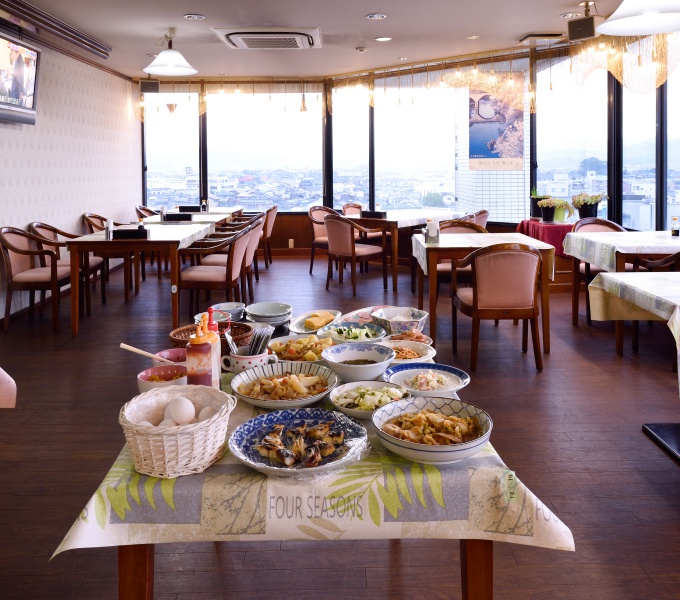 八女を見渡せるパノラマビューで雰囲気のよい朝食会場となっております。地元の食材で、毎日手作り料理を準備致しております。お米は地元、立花町産を農家から直接購入、使用しております。